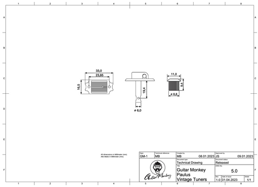 3l+3r Paulus Vintage Tuners Gitarren Mechaniken - Single Ring - No line - Vintage Buttons - 8,5 mm Bohrung