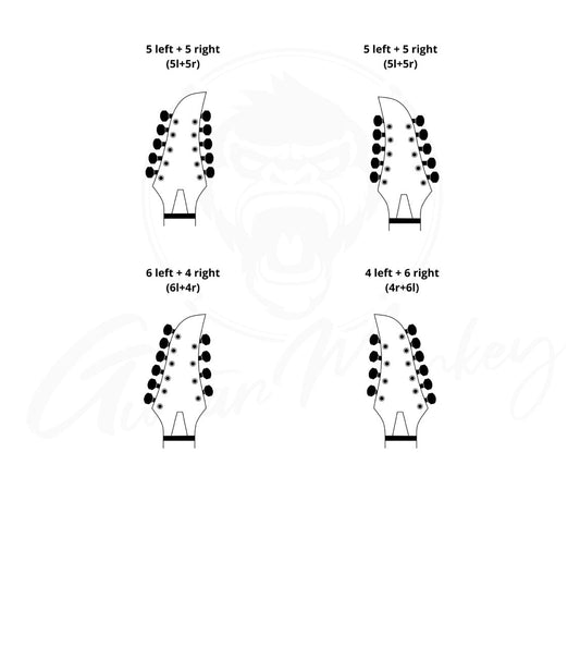 Um die Anordnung der Tuners auf dem Headstock (5l+5r, 6l+4r, 4l+6r), die Farbe und die Distanzringe zu wählen, klicke bitte auf die Tuners und wähle die Varianten in den Dropdown Menüs aus.